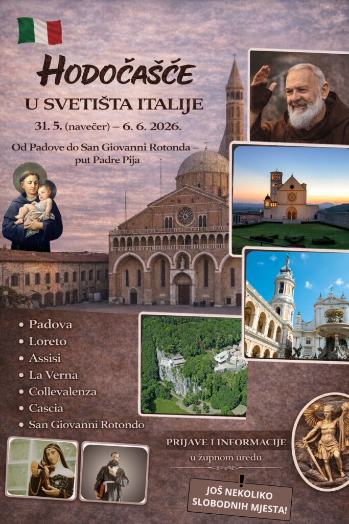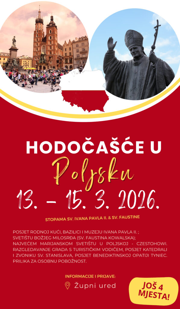 - Najavljujemo nekoliko hodočašća: Poljska-putevima Ivana Pavla II. i sv. Faustine Kovalske od 13.-15.03.; Međugorje od 29.04. -03.05. Podmilačje od 21.-24.06.; Italija-Putevima padra Pia, od Padove, Asiza do San Giovani Rotonda. 14.03. je jednodnevno hodočašće sv. Josipu u Karlovac, gdje će tog dana biti posveta crkve u baziliku. Informacije i prijave u župnom uredu.