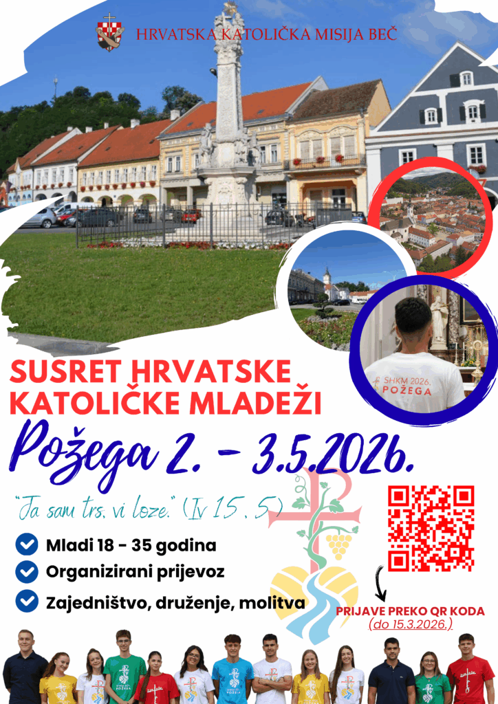 - Pozivamo mlade od 18 do 35 godina na Susret hrvatske katoličke mladeži koji će se održati u Požegi, 2. i 3. svibnja 2026. Prijave su otvorene do 15. ožujka 2026., a osiguran je organizirani prijevoz. Očekuju vas zajedništvo, molitva i radosno druženje s mladima iz cijele Hrvatske, BiH i inozemstva.Prijaviti se možete skeniranjem QR koda s plakata ili OVDJE.